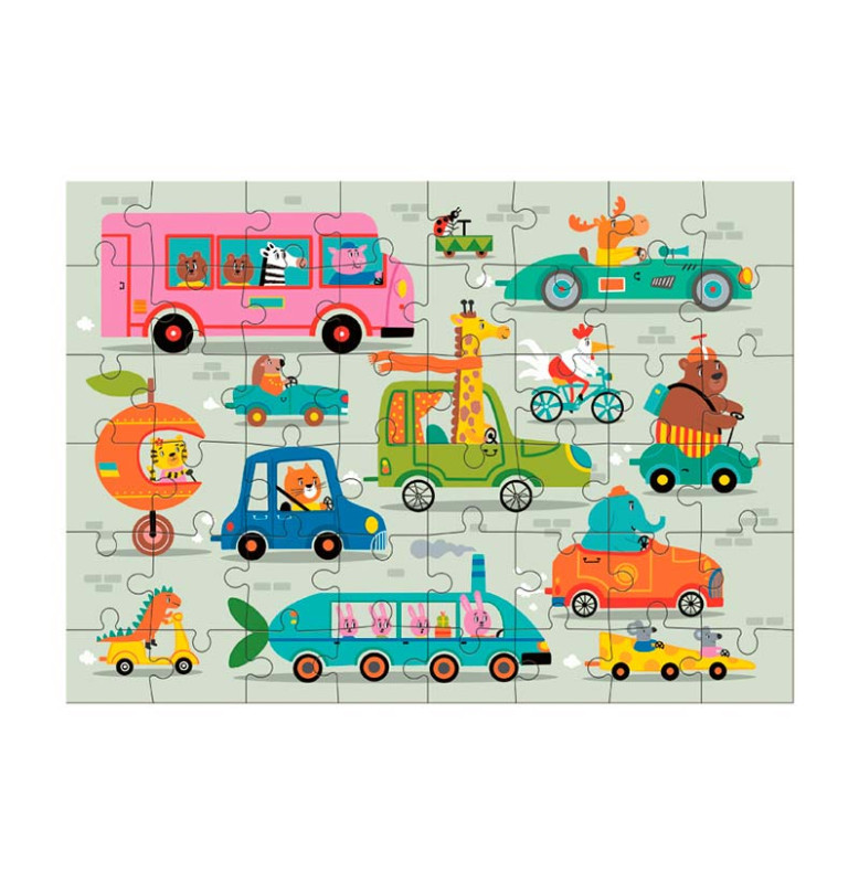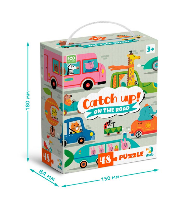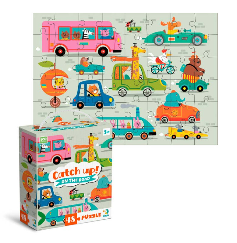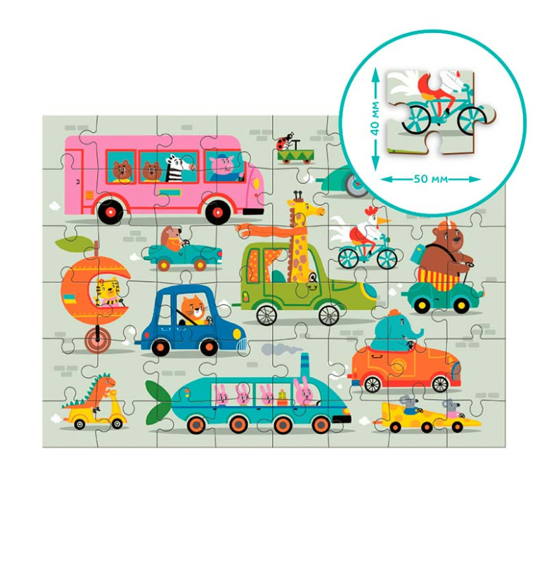 Пазл Dodo "Догоняй! На дороге" состоит из 48 элементов и захватывает яркими иллюстрациями, которые перенесут вашего ребенка в мир веселого дорожного движения. На картинке изображены разнообразные транспортные средства, управляемые милыми животными: автобус, гоночная машина, велосипед, скутер и даже одноколесное апельсино-авто.
