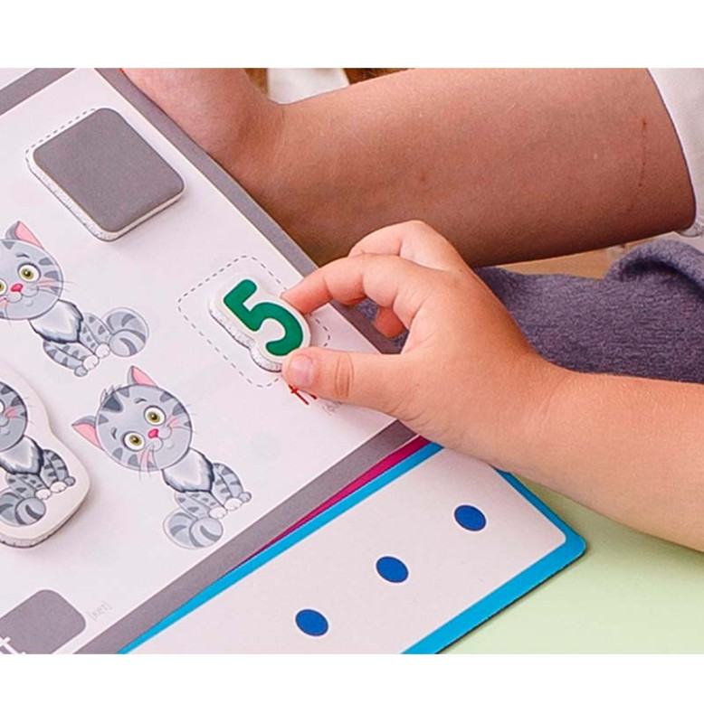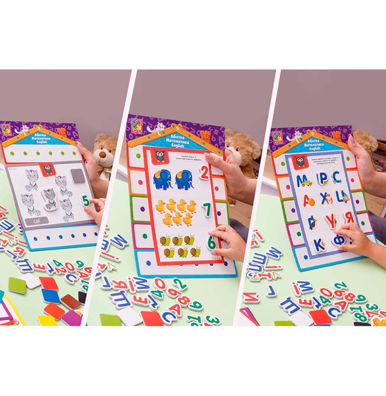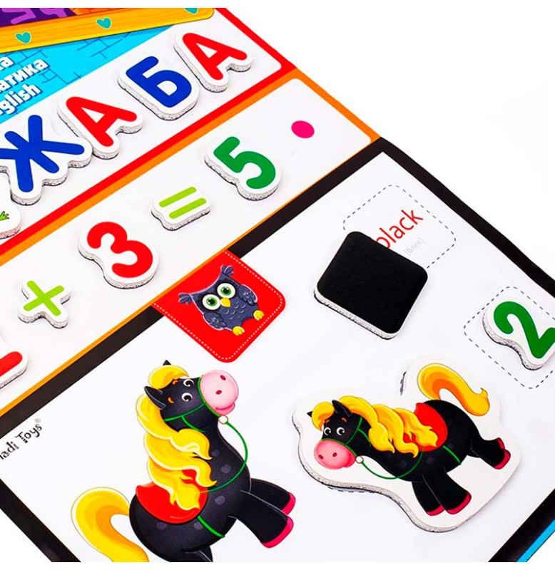 Вивчайте основи математики, української та англійської мови разом! Виконуючи завдання та граючись із магнітами, малюк відкриє для себе безліч нових знань і вмінь! Дитина навчиться розпізнавати літери, голосні та приголосні звуки; працюватиме над запам'ятовуванням алфавіту; вивчить цифри та числа, а також потренується в англійській мові, запам'ятовуючи назви тварин, цифр і кольорів. Придумуйте і свої власні завдання та виконуйте їх на спеціальній дошці! Усі магніти об'ємні. Їх легко кріпити та знімати. А також зручно тримати дитячою ручкою. Комплектація: магнітна дошка, 106 магнітів, 32 картки із завданнями.