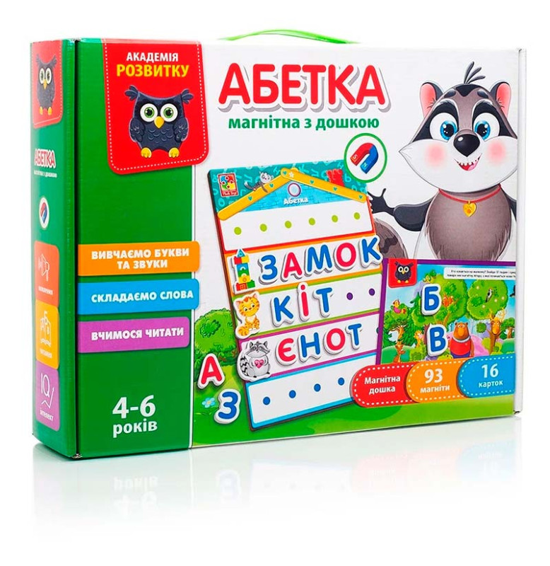 Комплектація: магнітна дошка, 93 магніти, 16 карток із завданнями