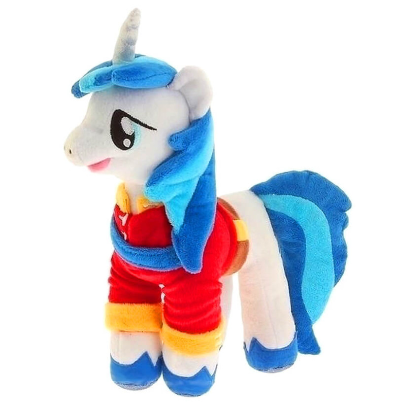 Єдиноріг Армор блакитного кольору з синіми копитами, одягнений у святкове вбрання - захопить Вашу дитину в світ фантазій, допоможе малюкові розвинути моторику і уяву. Іграшка дуже легка, ніжна, приємна на дотик, не деформується і зберігає свій зовнішній вигляд при машинному пранні.