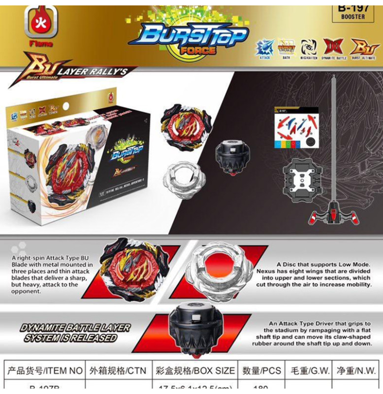 Аксесуари для налаштування: BEYBLADE B197 включає в себе різні аксесуари для налаштування покришок, що дозволяє гравцям змінювати характеристики своїх Бейблейдів та створювати унікальні комбінації.