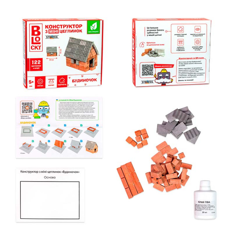 ? Комплектация: коробка, кирпичики – 122 эл., клей ПВА, комплект дополнительных элементов – 1 шт., инструкция.