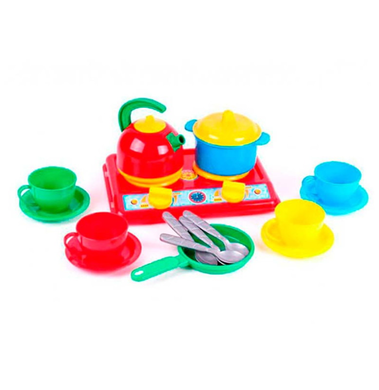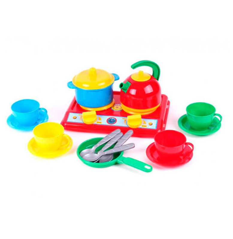 Посуд "Галинка 5" складається з плити, каструльки з кришкою, сковорідки, чайника, 4 чашок, 4 блюдець і 4 ложок.