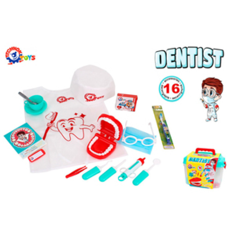 Ігровий набір Стоматолог - як навчити діточок правильно чистити зубки? Це справді відповідальне і важливе завдання для всіх батьків. А для всіх малюків подарунок - справжня дитяча зубна щітка. Тепер хлопчики та дівчатка із захопленням вчитимуться доглядати за своїми зубками та лікуватимуть їх улюбленим іграшкам. А дотримуватися всіх правил гігієни в стоматологічному кабінеті допоможе спеціальна накидка лікаря з цікавим принтом, шапочка і, головне, захисна маска. Так малюк точно відчує себе справжнім лікарем. У наборі професійні стоматологічні інструменти бур, дзеркало і зонд, а також шприц, пінцет, окуляри, бейдж, коробочка з пігулками, нумерація зубів і чашку з ложечкою на тарілочці. І звичайно, найцікавіше - модель щелепи. Тепер усі зубки можна ретельно оглянути і добре полікувати. Іграшка Набір стоматолога допоможе дітям навчитися доглядати за своїми зубками і подолати страх перед відвідуванням стоматологічного кабінету. Набір стане чудовим подарунком для кожного малюка. Іграшка виготовлена з міцного якісного пластику без запаху. Для дітей від 3-х років. У комплекті бонус - дитяча зубна щітка. Упаковка - зручний саквояж із ручкою та замками. Виробник може змінювати колірну гамму товару без попередження. Наявність кольорів уточнюйте у менеджера компанії.