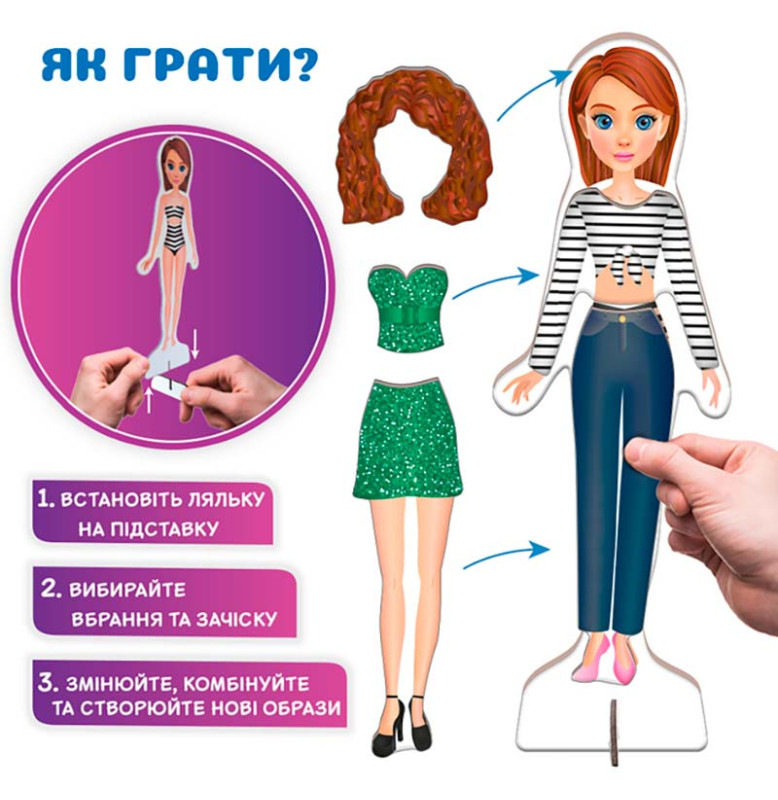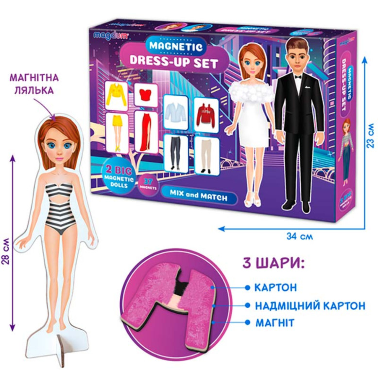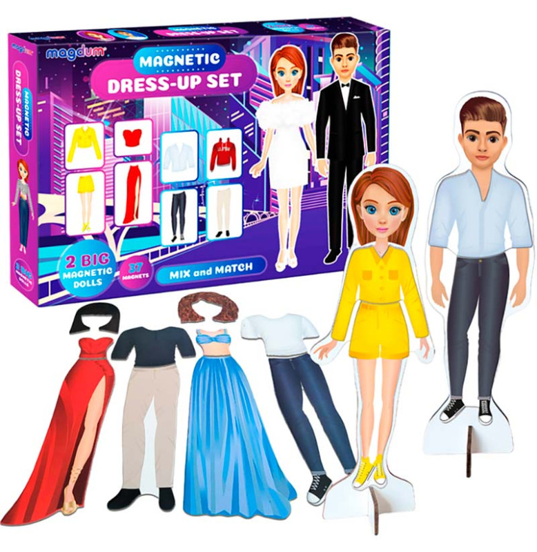Комплектація: дві ляльки хлопець та дівчина, підставка для ляльки, 37 магнітів.