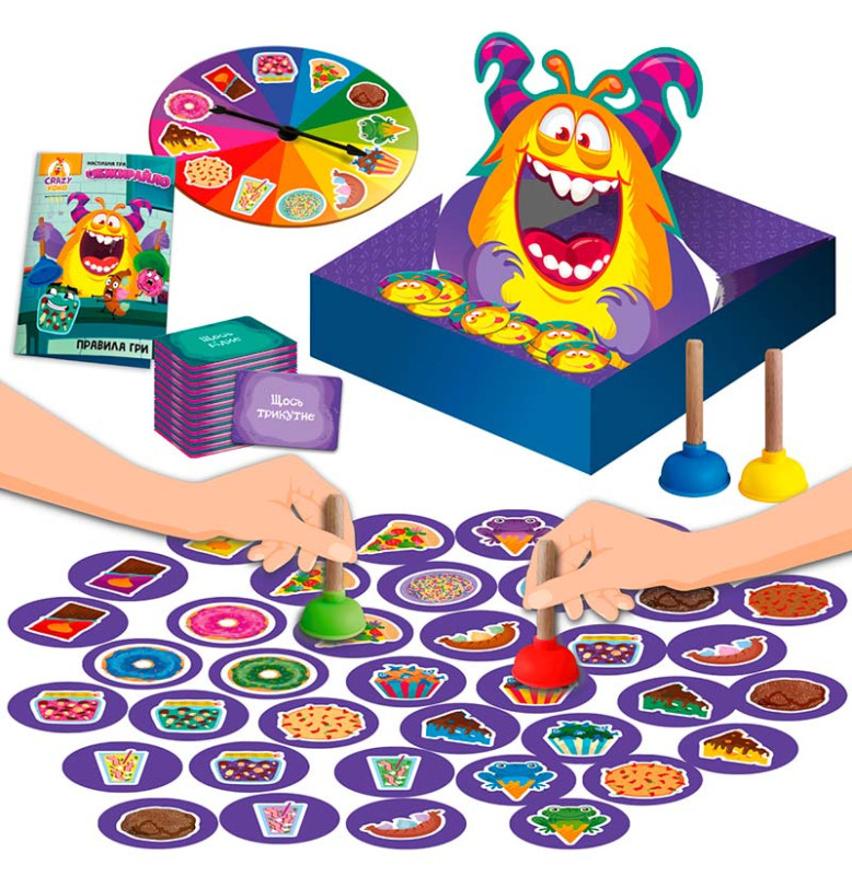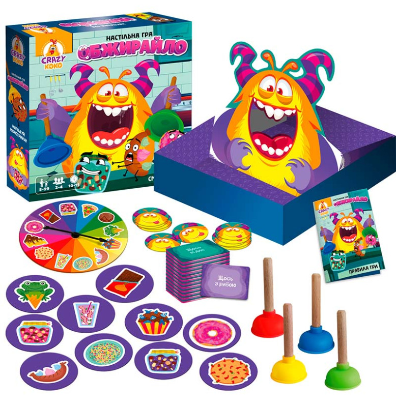 Комплектация: 1 фигурка Обжирайла, 1 колесо удачи, 4 вантузы, 36 монстрострав, 36 карточек с заказом, 36 жетонов, правила игры.