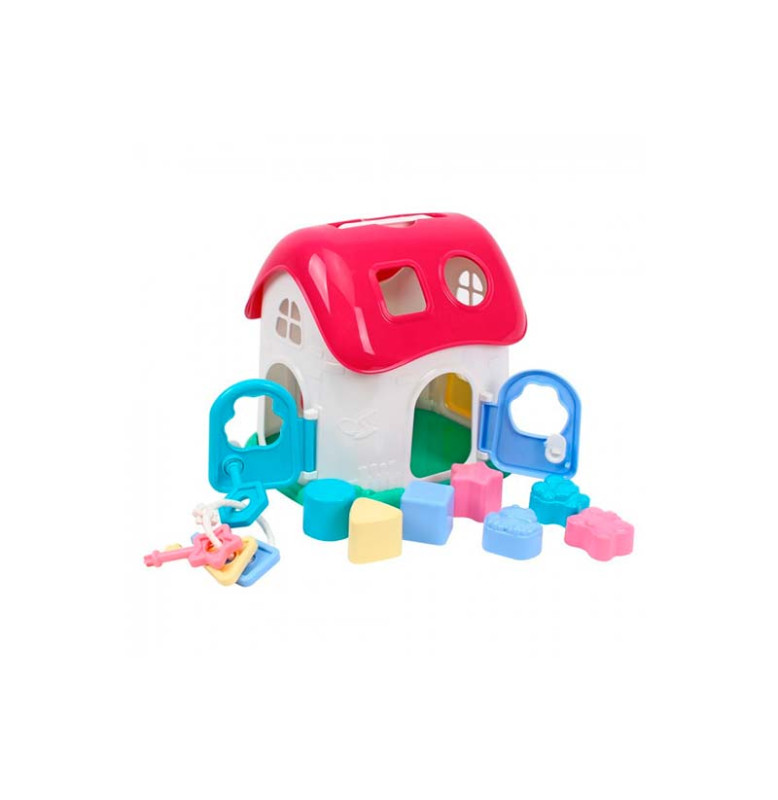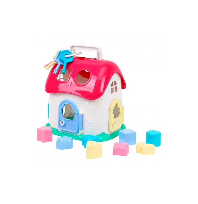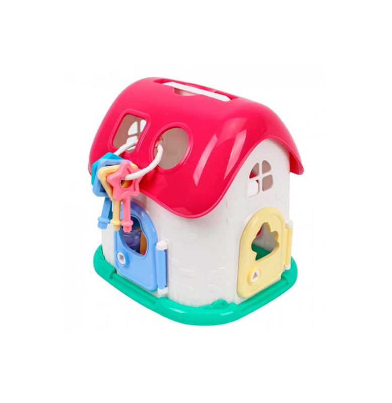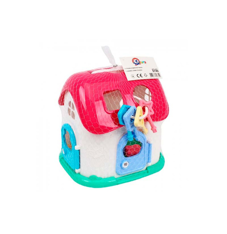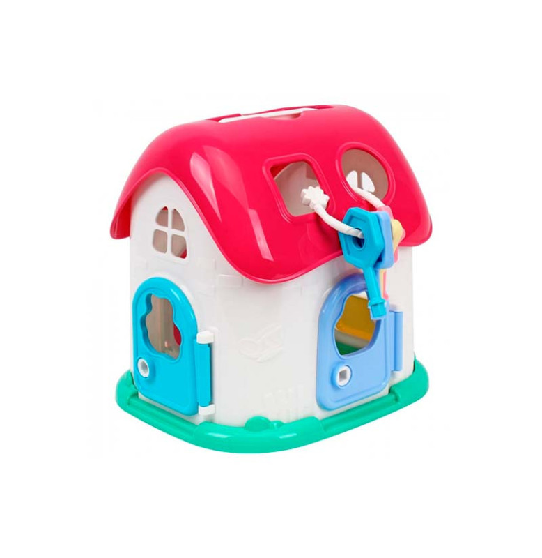 Домик ТехноК, арт. 6740 – это большая избушка-сортер с 4-ю дверью под нежной розовой крышей и с белыми рельефными стенами. А снизу – красивая зелененькая основа, похожая на газон.
