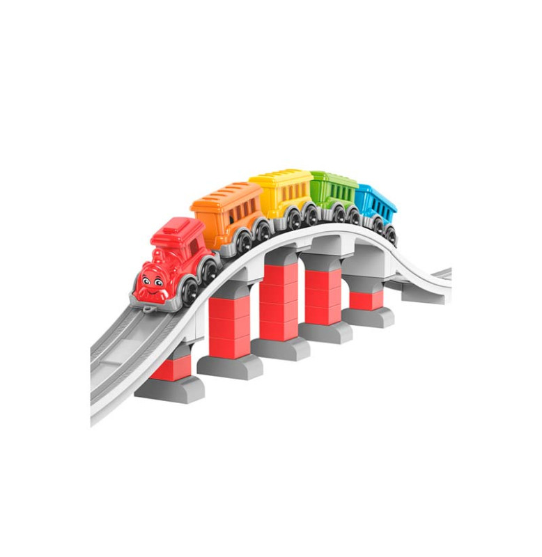 Ваш ребёнок будет в восторге, собирая свою собственную железную дорогу с ярким поездом: улыбающийся локомотив и четыре разноцветных вагончика.