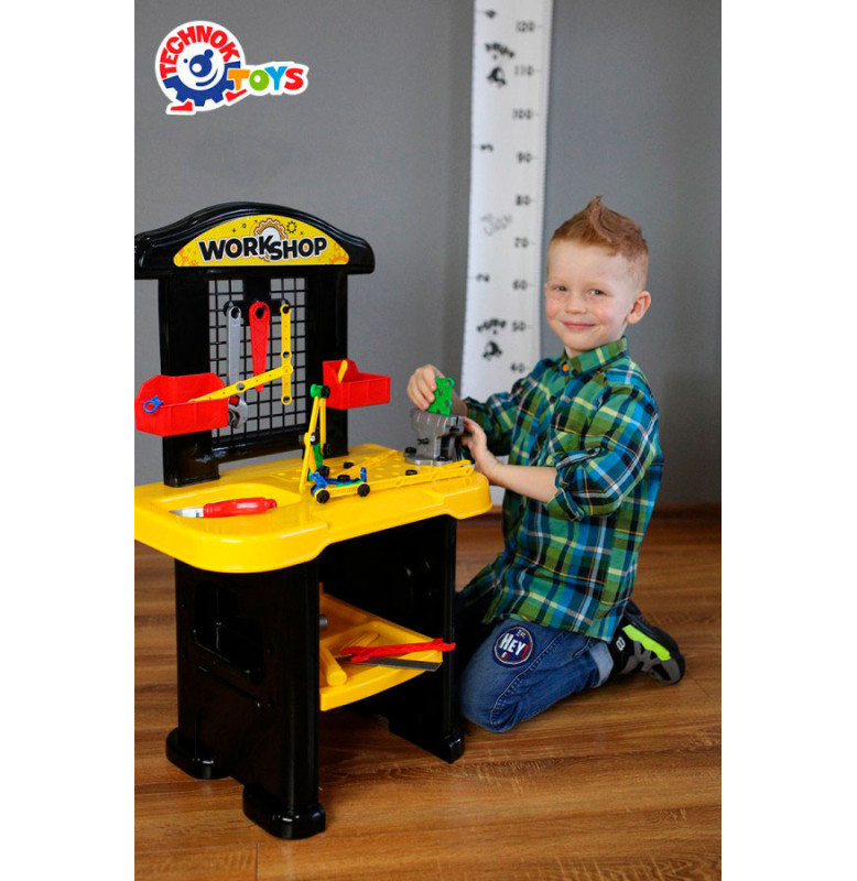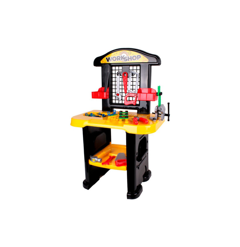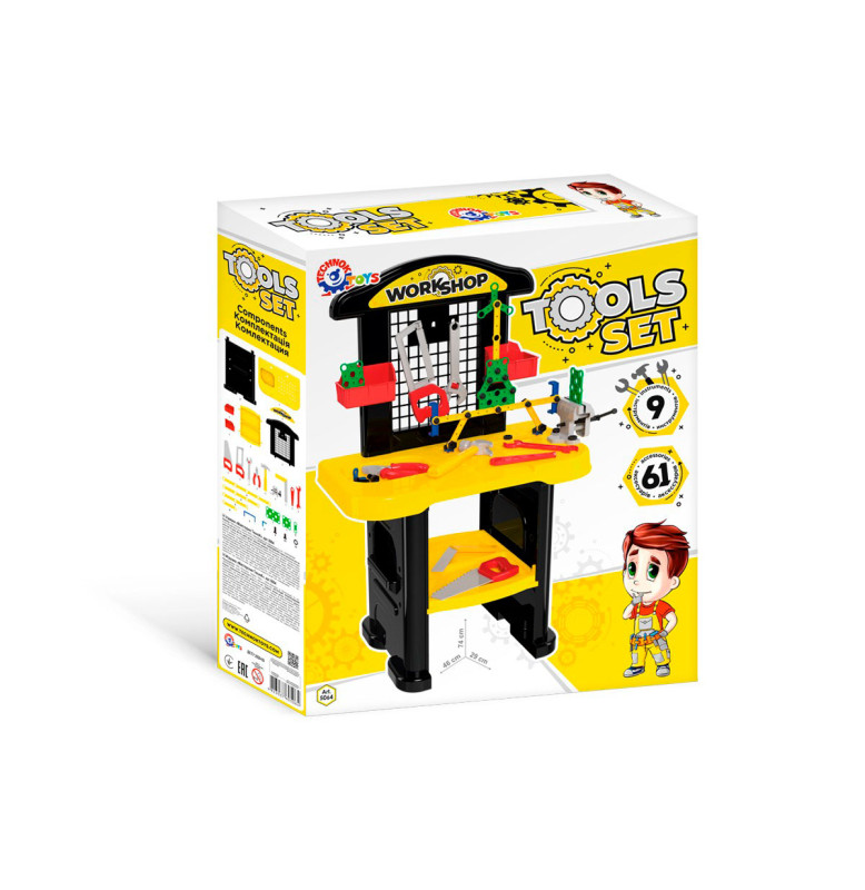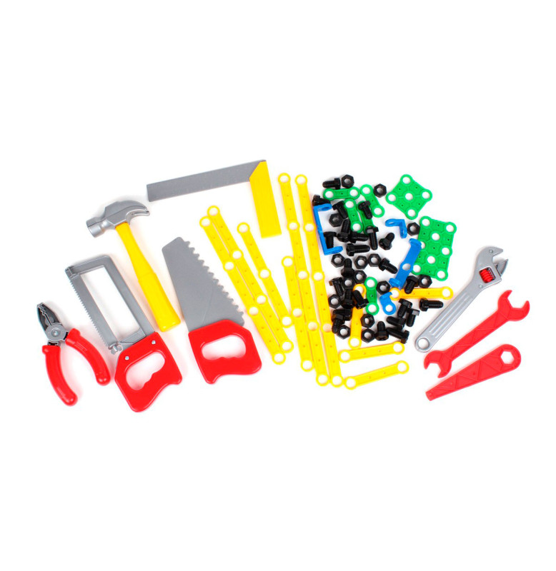 Іграшкова майстерня для маленьких помічників. У наборі: пили по металу і дереву, розвідний ключ, куточок, молоток, плоскогубці, лещата, ключ ріжковий, викрутка, 17 планок різного розміру, 4 фігурні деталі і куточки, 25 болтів і 15 гайок. Усі елементи виготовлені з якісного міцного пластику без запаху. Іграшкова майстерня неодмінно стане улюбленою іграшкою для ваших дітей. Розміри іграшки в зібраному вигляді: 74*46*29 см. Розмір упаковки: 57,5*48,5*15 см. Виробник може змінювати колірну гамму товару без попередження. Наявність кольорів уточнюйте у менеджера компанії.