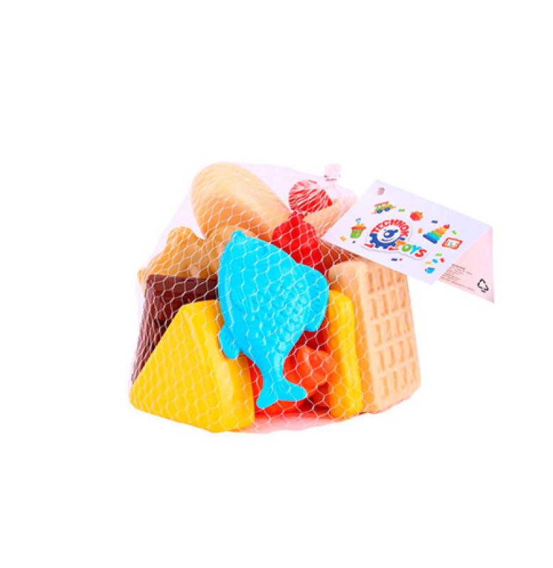 Батон, сир твердий, курячі гомілки, хот-дог, картоплини фрі та кетчуп як у справжніх наборах фаст фуду. А для затишного чаювання зі "смачними" десертами є пончик, круасан, шоколадка та вафлі. Про вечерю теж не забули – вибирайте смажена рибка чи ніжна курятина. Всі продукти у наборі мають реалістичний вигляд та приємний колір. Зручний розмір іграшок спеціально розрахований для дитячих рук. Він також добре підходить до іграшкового посуду, візочків для супермаркетів та кошичків ТехноК.