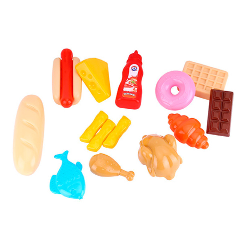 В наборі: булка хот-дога – 1 шт., сосиска – 1 шт., пляшка "Кетчуп" – 1 шт., гомілка – 1 шт., картопля фрі – 3 шт., тушка куряча – 1 шт., риба – 1 шт., сир – 1 шт., батон – 1 шт., круасан – 1 шт., пончик – 1 шт., шоколад – 1 шт., вафлі – 1 шт.