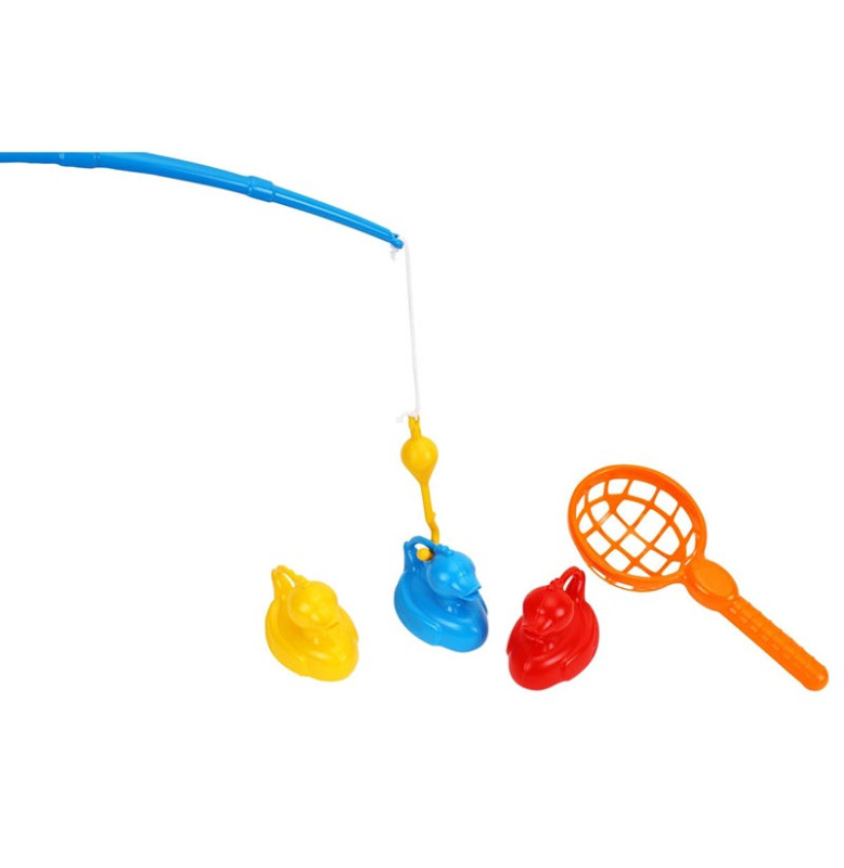 У комплекті є зручна вудка з поплавком, великий підсак та 3 яскраві гумові качечки. Фігурки качок виготовлені методом видування, тому вони легкі та чудово тримаються на поверхні води.