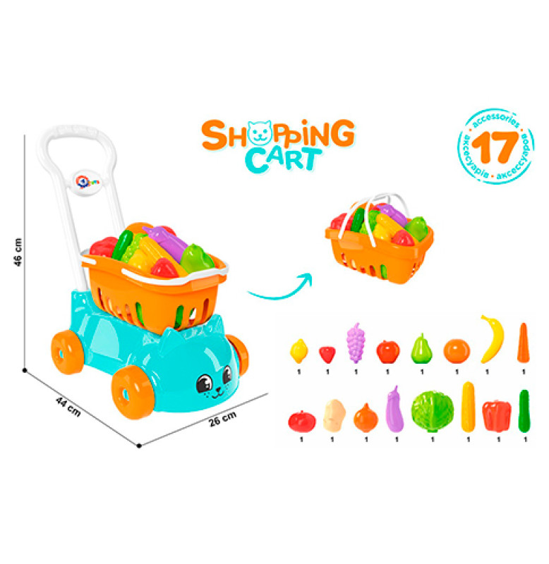 Комплектація: візочок з ручкою, знімний кошик, 16 іграшкових овочів та фруктів (8 овочів і 8 фруктів)