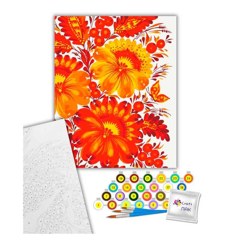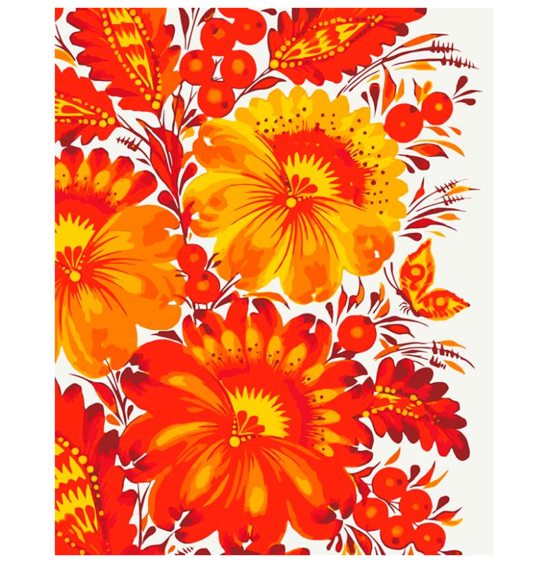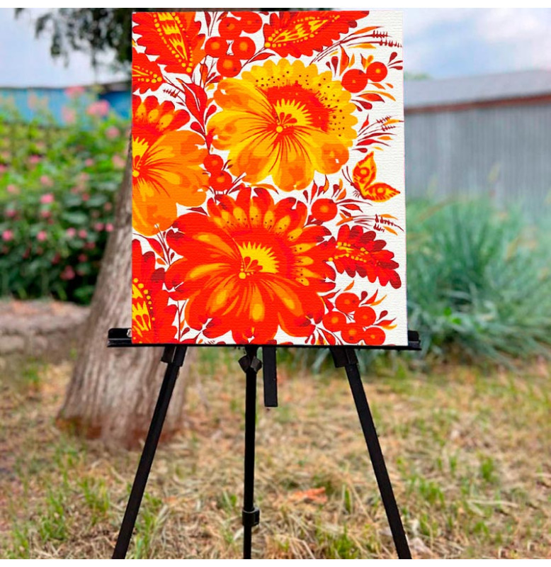 Насичена та витончена інтерпретація народного петриківського розпису, пристосована до формату картини за номерами. Кожен штрих наближає до створення яскравого флористичного орнаменту з багатими відтінками, що додає інтер’єру тепла і етнічного шарму. Процес малювання спроектований так, щоб приносити задоволення і знімати напругу — підходить як для початківців, так і для тих, хто вже має досвід у творчості.