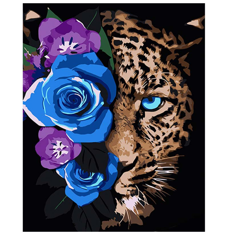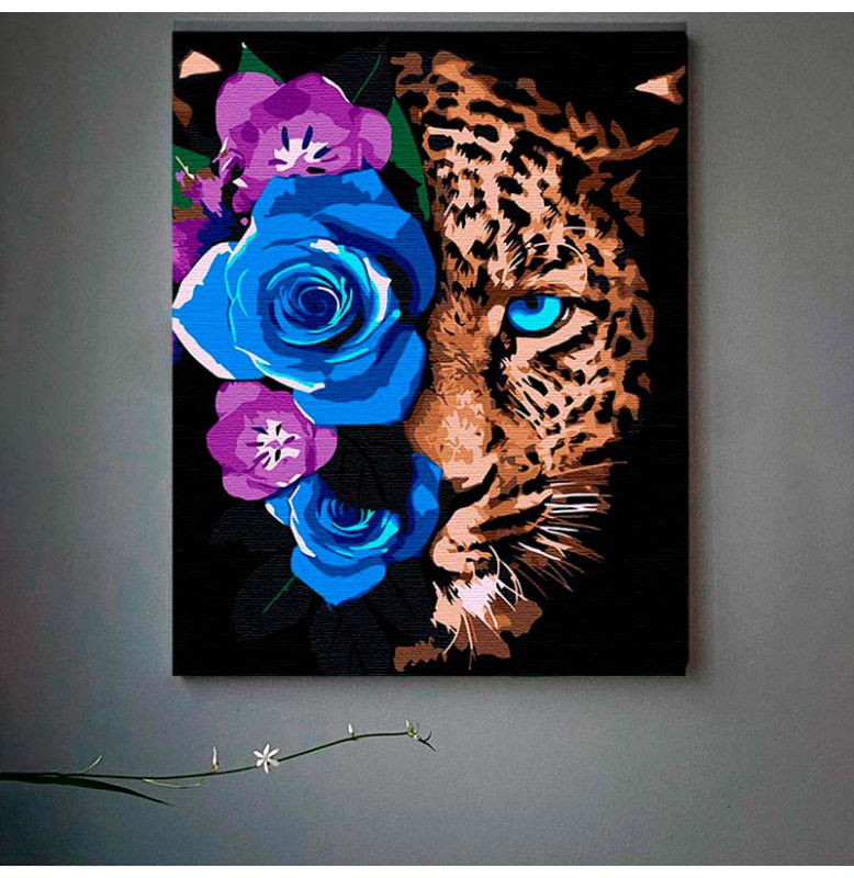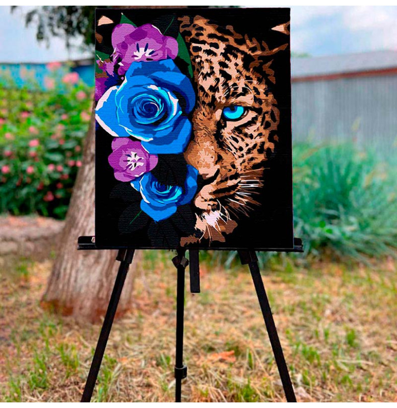 Картина за номерами Леопард у квітах Strateg на чорному фоні 40х50 см AH1033