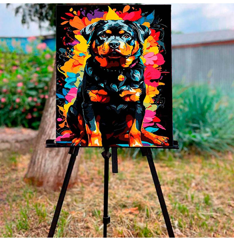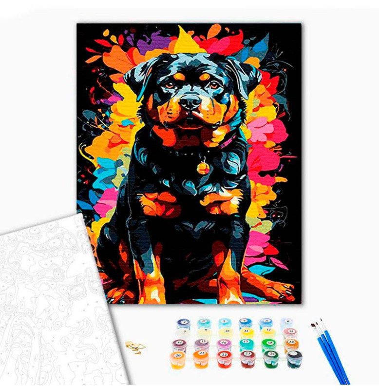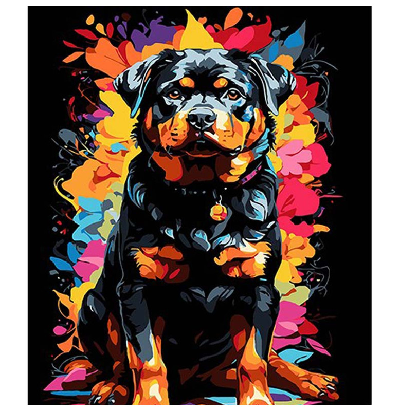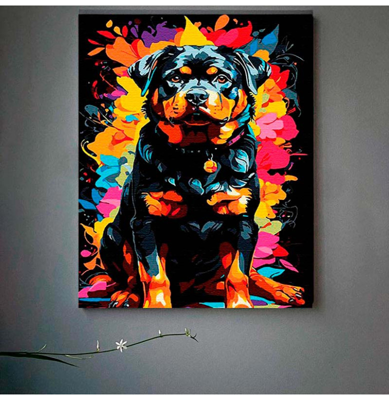 Картина за номерами Ротвейлер на фоні кольорових квітів Strateg на чорному FH-10