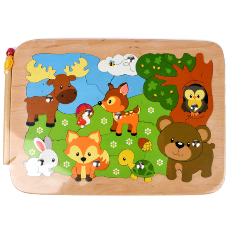 Габаритний розмір виробу 290 ? 210 мм. Склад комплекту: рамка фанерна нефарбована розміром 290 ? 210 мм - 1 шт., дерев''яна паличка циліндричної форми (діаметром 8 мм, завдовжки 150 мм), що з''єднана з магнітною кулькою (діаметром 4 мм) мотузкою з полімерного матеріалу завтовшки 2 мм і завдовжки 100 мм - 1 шт., фарбовані елементи у формі оленя - 2 шт., сови - 1 шт., ведмедя - 1 шт., зайця - 1 шт., лисиці - 1 шт., черепахи - 1 шт., елементи тла зеленого - 10 шт., блакитного кольору - 13 шт. Усі елементи у формі звірів мають металевий сердечник діаметром 5 мм по центру самої фігури. Виріб призначений для дітей старше 3-х років. Упаковано в термоплівку