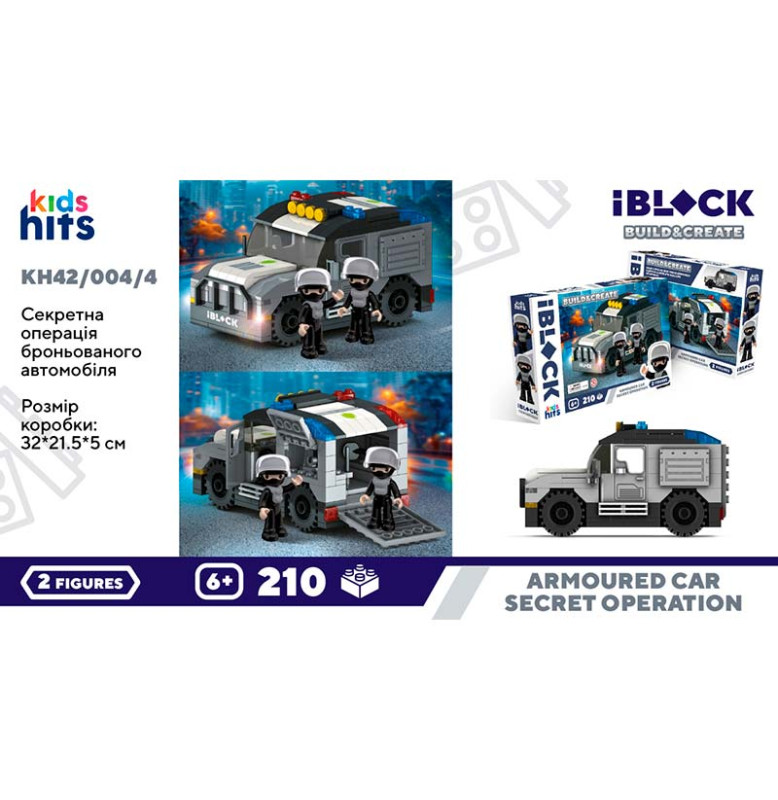 Конструктор IBLOCK Build & Create "Секретная операция бронеавтомобиля" (артикул KH42/004/4) состоит из 210 деталей и включает две фигурки.