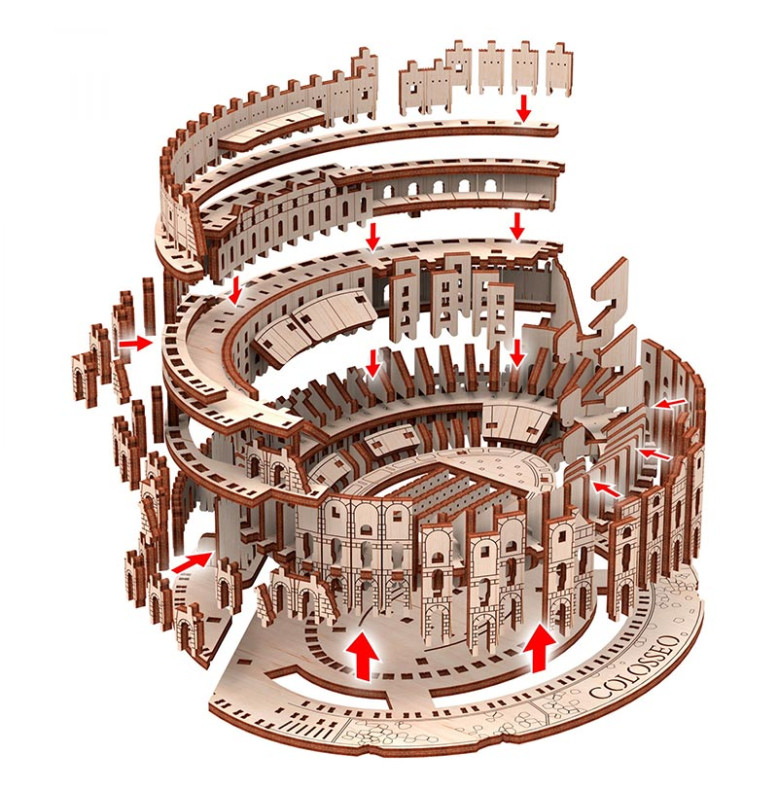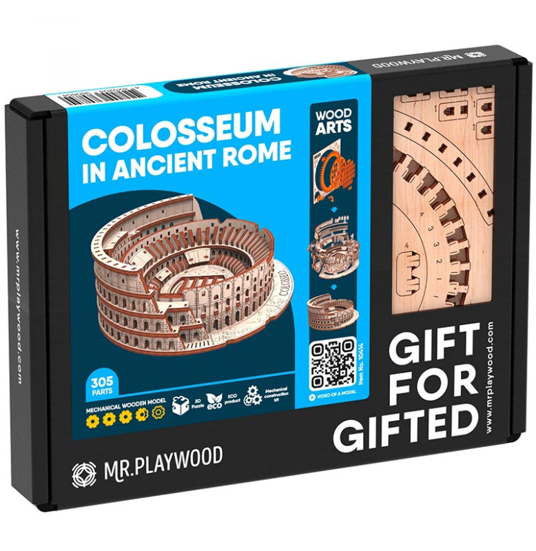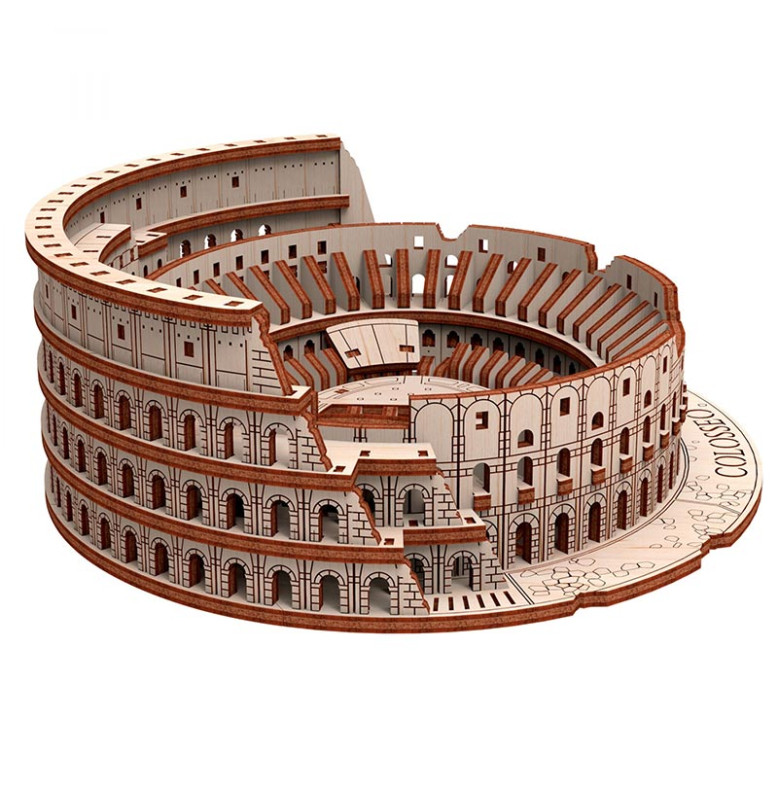 Цей механічний дерев'яний конструктор переносить у атмосферу античного світу, відтворюючи велич і вишуканість Колізею. Кожна арка і фасадна деталь виконані з увагою до стилю, а вбудований механізм додає моделі динаміки й живого характеру.