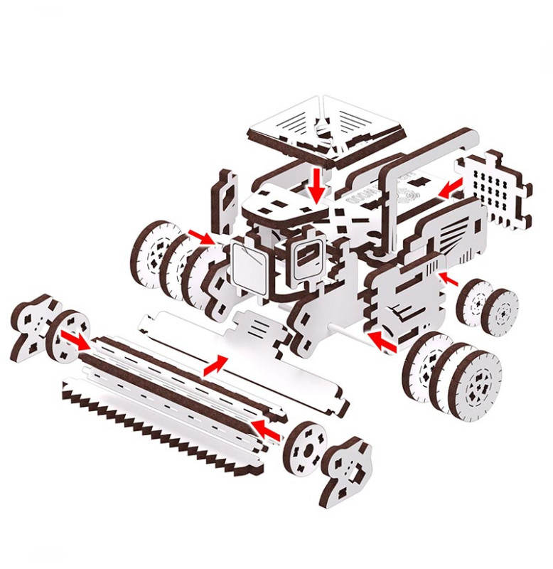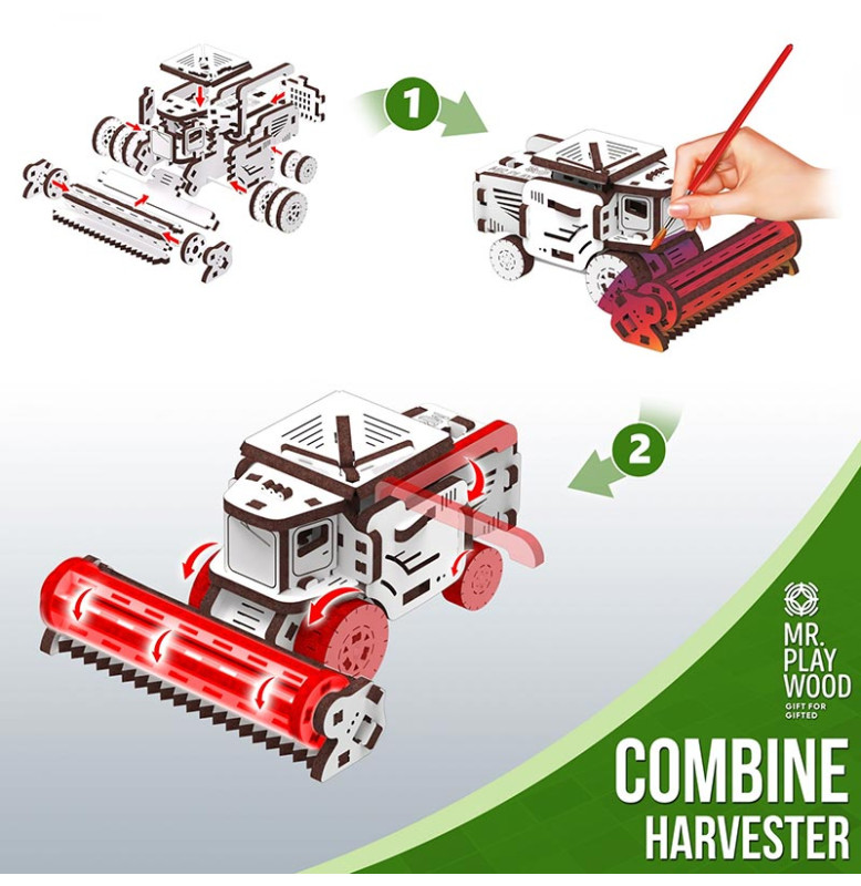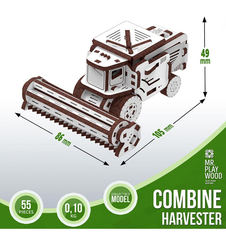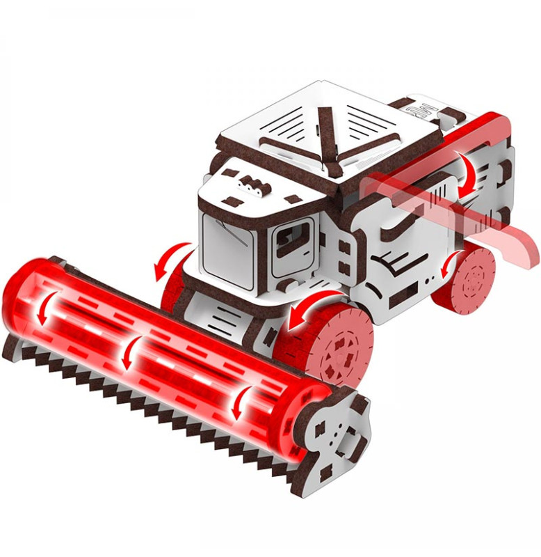 Дерев'яний механічний конструктор, який поєднує в собі реалістичний дизайн та захопливу гру. Ця модель відтворює основні елементи зернозбирального комбайна з рухомими частинами, що дозволяє дітям і дорослим збирати і випробовувати техніку власноруч.