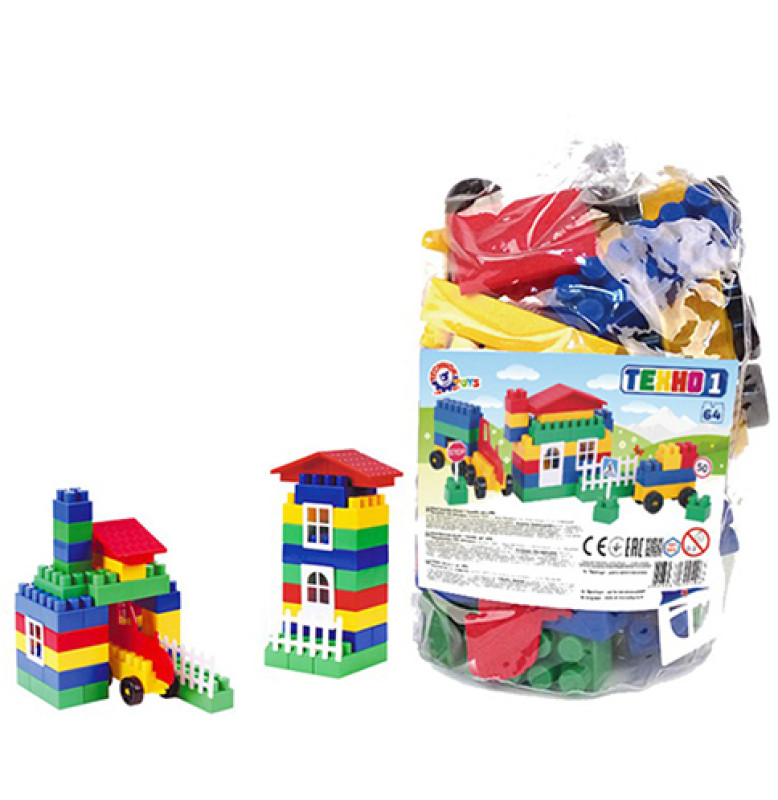 Конструктор №1 пластмасовий складається з 60 елементів і упакований у пакет.