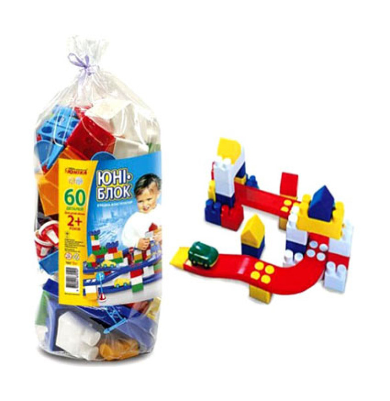 Конструктор з великими деталями "Юні-блок" - складається з квадратних блоків, прямокутних вузьких блоків, прямокутних довгих блоків, дахів, скошених дахів, машинок, трас для машинок. Чудова іграшка для розвитку просторового мислення та уяви для малюків від 2-х років. Розвиває у дитини мислення, увагу, посидючість, уяву, фантазію, дрібну і велику моторику, точність і координацію рухів. Виготовлена з якісної міцної твердої пластмаси, не містить токсичних барвників і добавок - безпечна для вашої дитини.