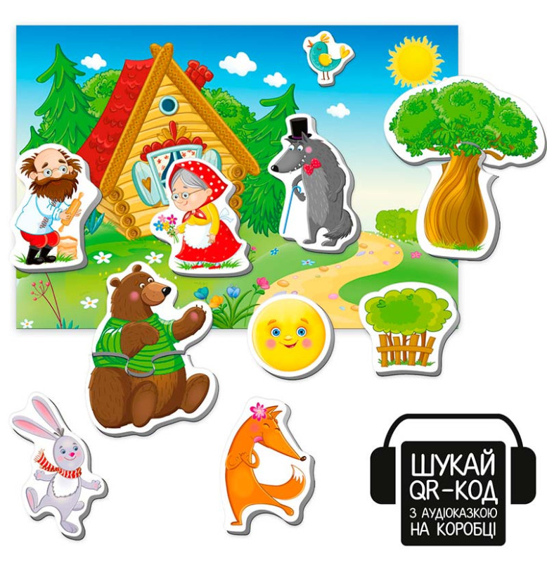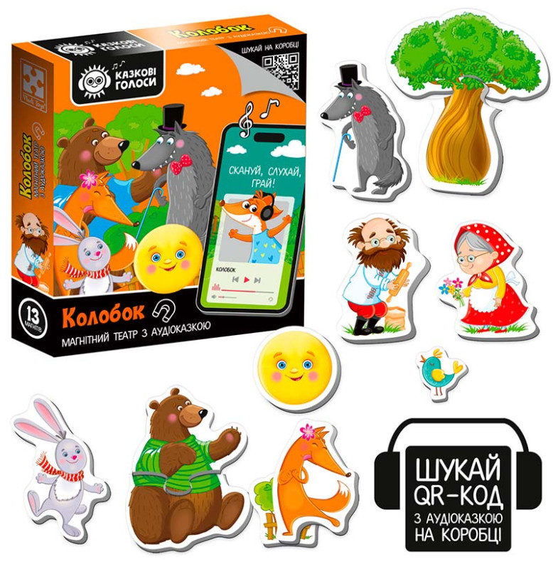 Відкривши коробку, ви отримаєте не лише яскраві магніти (13 шт.) з героями та декораціями, а й поле для гри. Завдяки QR-коду, який легко знайти під перфорованою смужкою на звороті упаковки, можна одразу перейти до прослуховування аудіоказки «Колобок» зі смартфона або планшета.