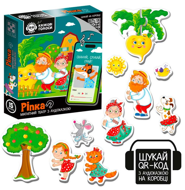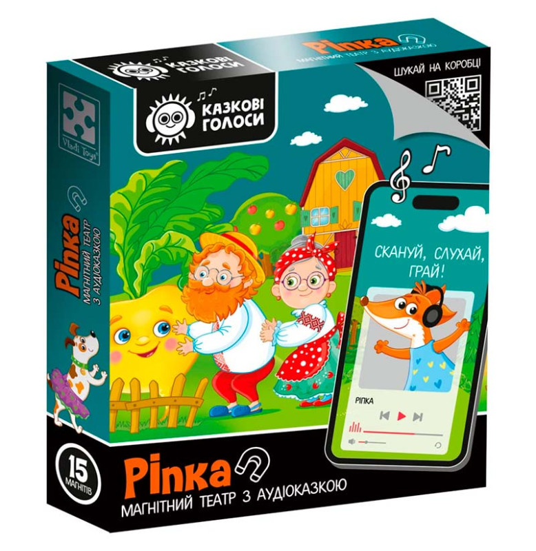 Театр і казка у коробці - комбо 2 в 1! Відкрийте коробку з магнітним театром серії “Казкові голоси”. На зворотній частині коробки відкриється QR-код. Відскануйте QR-код за допомогою гаджета і перейдіть за посиланням. За посиланням знаходиться аудіоказка “Ріпка”. Включайте малюку аудіоказку, коли немає змоги почитати, слухайте також разом чи грайте з магнітами під аудіотрансляцію.