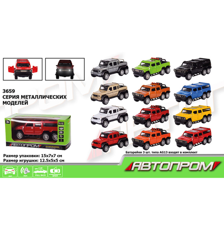 Машина металл 3659 (96шт/2) "АВТОПРОМ",1:32-36,3 вида по 4 цвета, батар., свет, откр.двери, в кор. 1