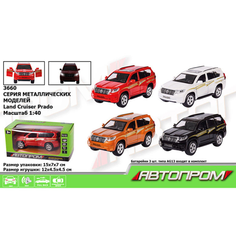 Машина металл 3660 (96шт/2) "АВТОПРОМ",1:32-36,4 цвета, батар., свет, откр.двери, в кор. 15*6,7*7см
