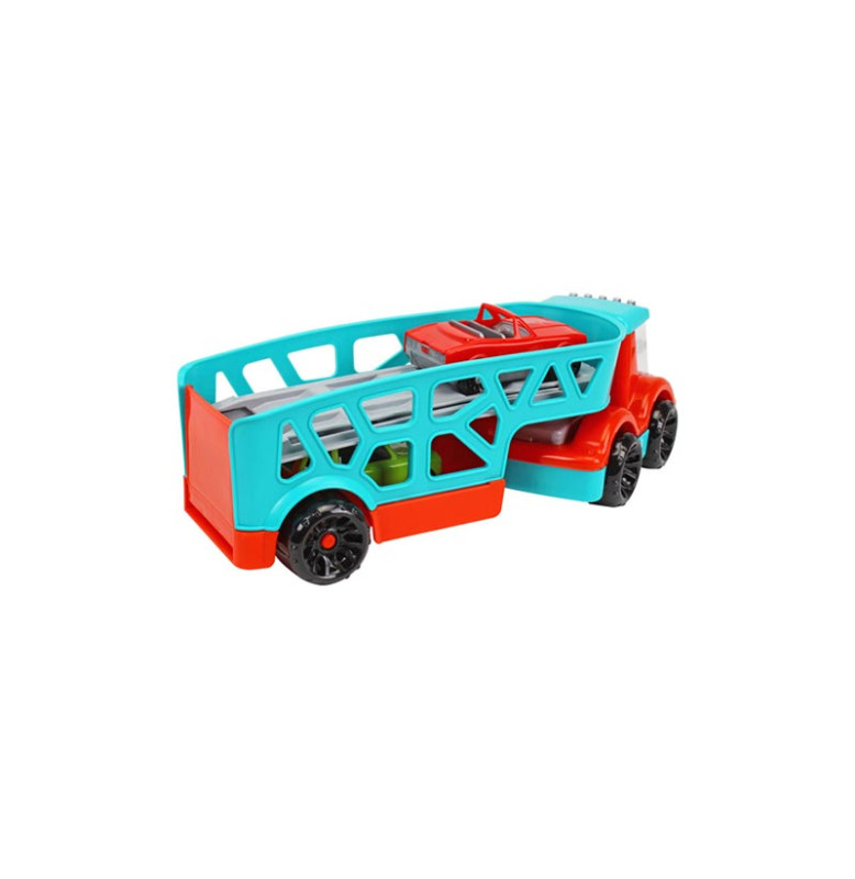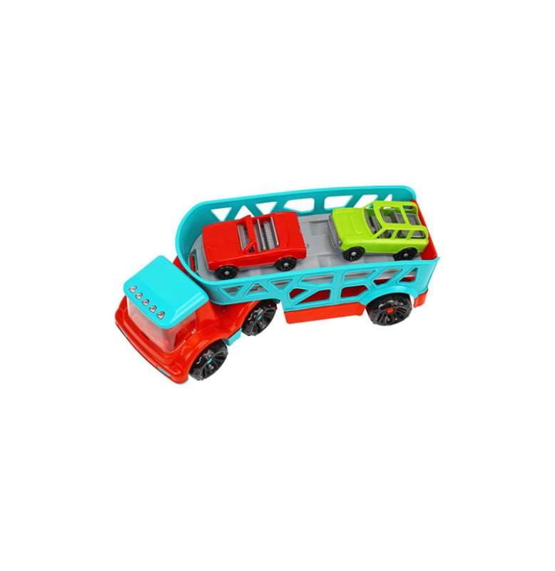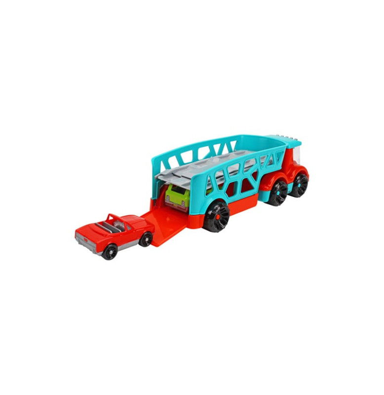 Цей потужний автовоз розміром 32х13х14 см має рухомий причіп і велике прозоре лобове скло, що робить його максимально реалістичним. У комплекті — дві яскраві машинки, готові до нових мандрівок. Нижня платформа оснащена відкидним бортом-трапом, а верхня — висувним трапом, тож завантаження та розвантаження стають цікавою грою.