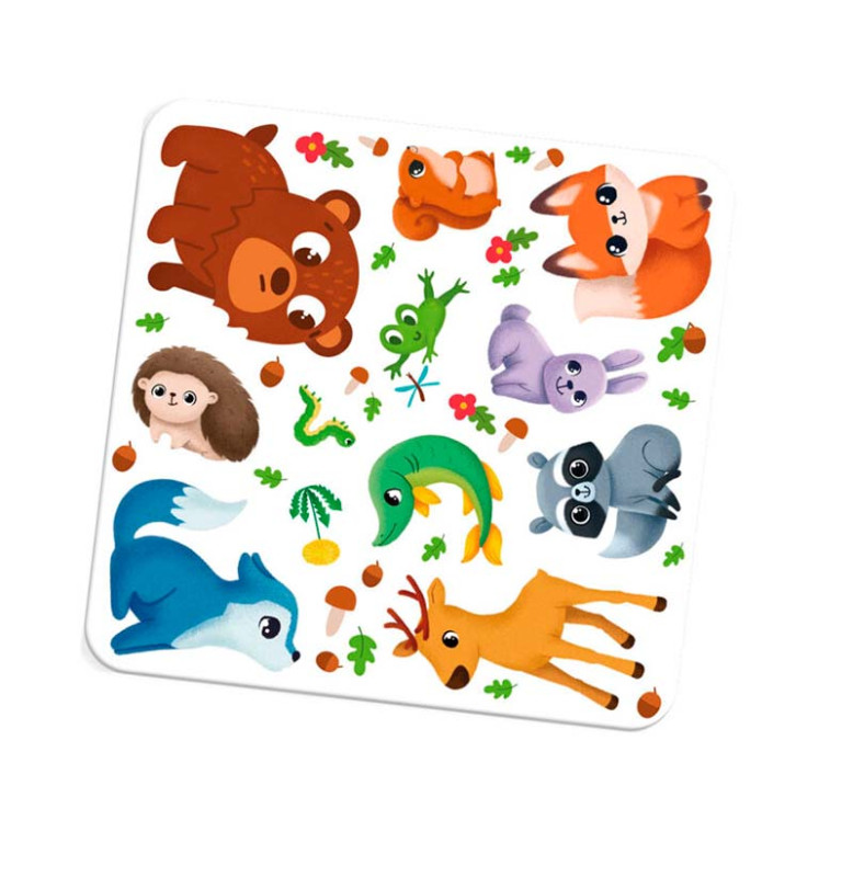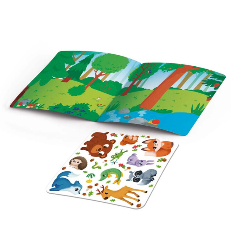 У набір входять різноманітні елементи для декорування та гри: барвисті зображення лісових тваринок, рослинні мотиви та тематичні наліпки, які легко приклеюються й дозволяють створювати власні сцени та казки. Матеріали продумані так, щоб робота була цікавою й безпечною, а результат — яскравим і довговічним.
