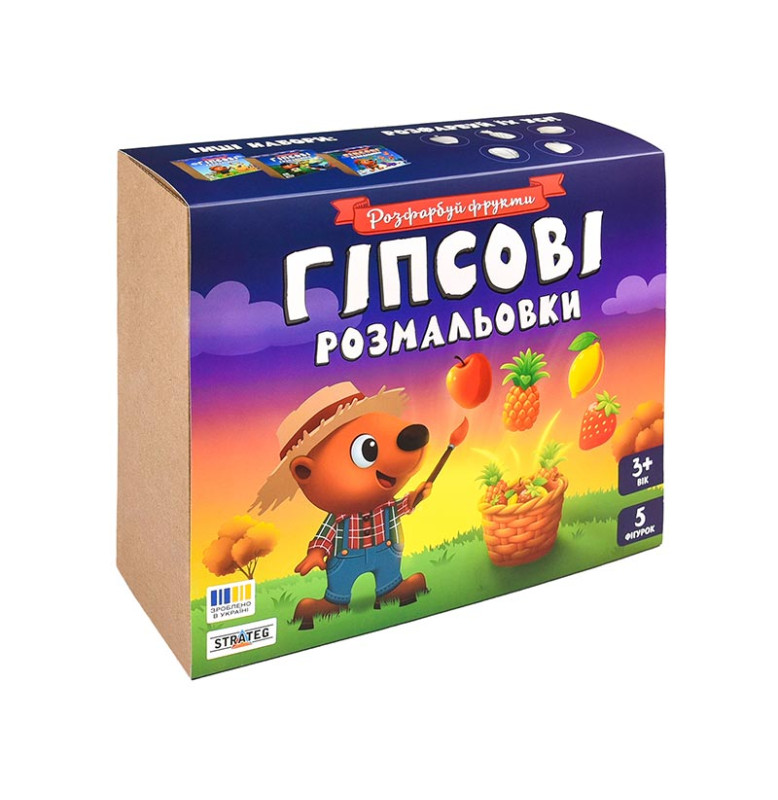 В набор входят 5 гипсовых фигурок в виде сочных фруктов и ягод: яблоки, груши, лимона, клубники и ананаса. Задача простая, но увлекательная: раскрасить их яркими красками и кисточкой, которые есть в комплекте, и превратить обычные гипсовые заготовки в настоящие художественные шедевры.