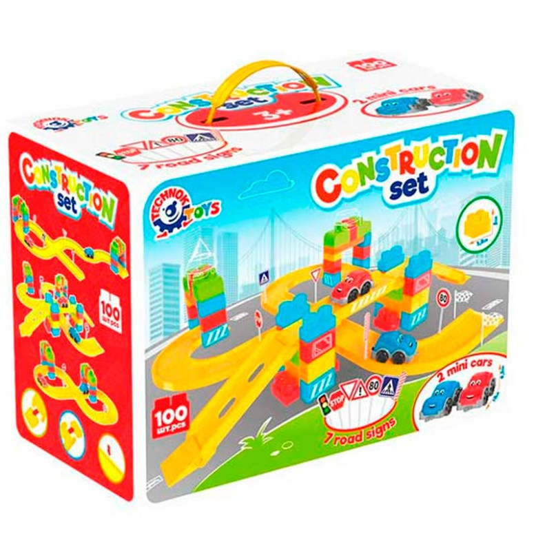 Іграшка "Конструктор ТехноК" – це 100 різноманітних елементів, серед яких траси з перехрестями та поворотами, спуски, дорожні знаки та машинки. Будівельні цеглини великі та зручні для маленьких діточок. З них можна збудувати різноманітні фігури: гаражі, паркінги, будиночки, кораблі чи фігури тваринок.