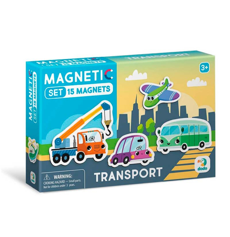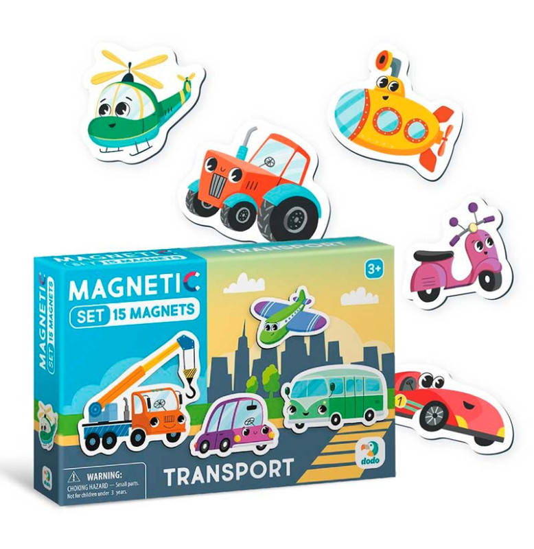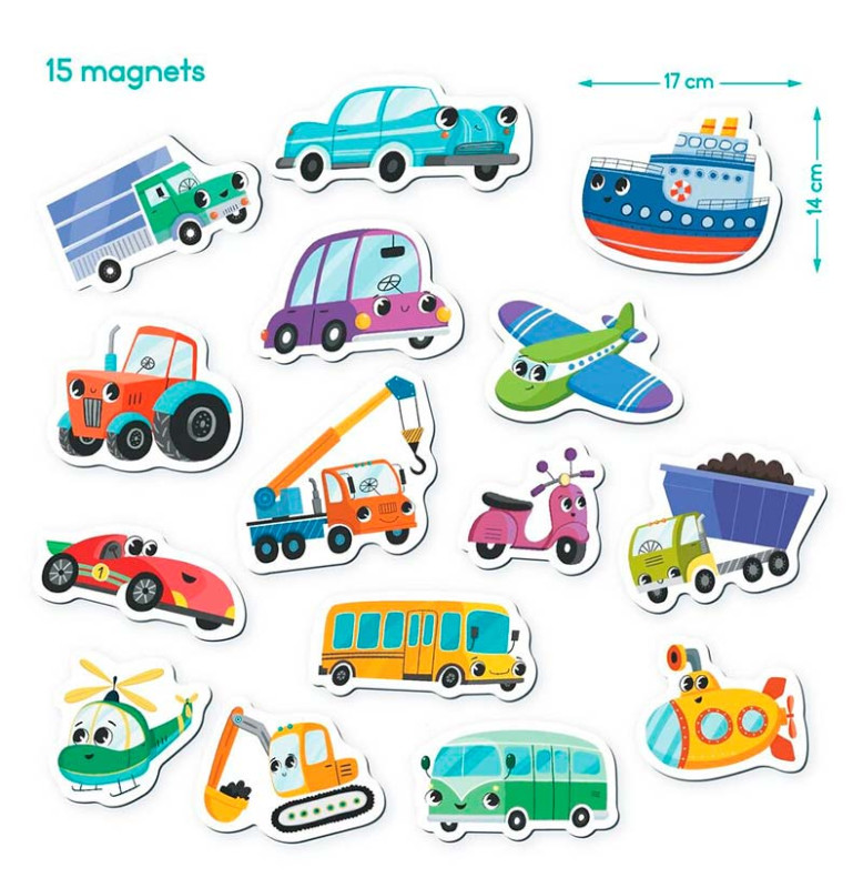 У цьому наборі міститься 15 магнітів, і кожен з них зображає різні види транспорту, від автомобіля та мопеда до гелікоптера та підводного човна. Діти можуть розміщувати ці магніти на магнітній дошці або холодильнику, створюючи власні історії та пригоди, де транспорт відіграє важливу роль.