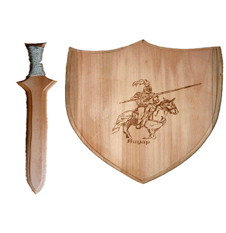 Іграшковий набір зброї "Лицар" артикул 172067, призначений для дітей віком від 3 років. Склад: щит дерев''яний 35?24 см із гравірованим зображенням (фігура воїна верхи на коні) - 1 шт.; меч дерев''яний 45?6 см - 1 шт. Призначено для відтворення образу давнього воїна. Упаковано в термоплівку та якісну гофрокартонну коробку.