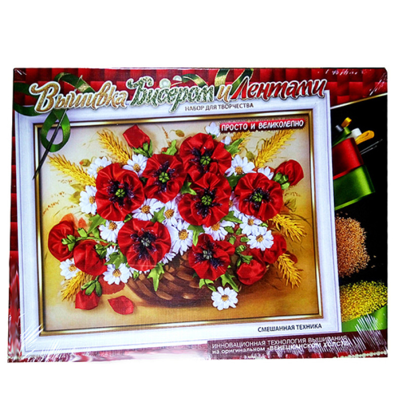 Докладні схеми для вишивання нанесені прямо на полотні, що спрощує роботу з підбором бісеру та стрічок, роблячи процес вишивання інтуїтивно зрозумілим, не займаючи багато часу. До набору входять: 1 полотно, 1 багетна рамка, 1 набір тонких стрічок, 1 набір широких стрічок, 5 наборів різнокольорового бісеру, 2 голки, 1 моток ниток, докладна інструкція. Комплект виготовлений зі щільного картону, текстилю, дерева.