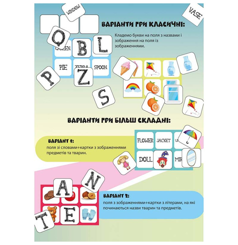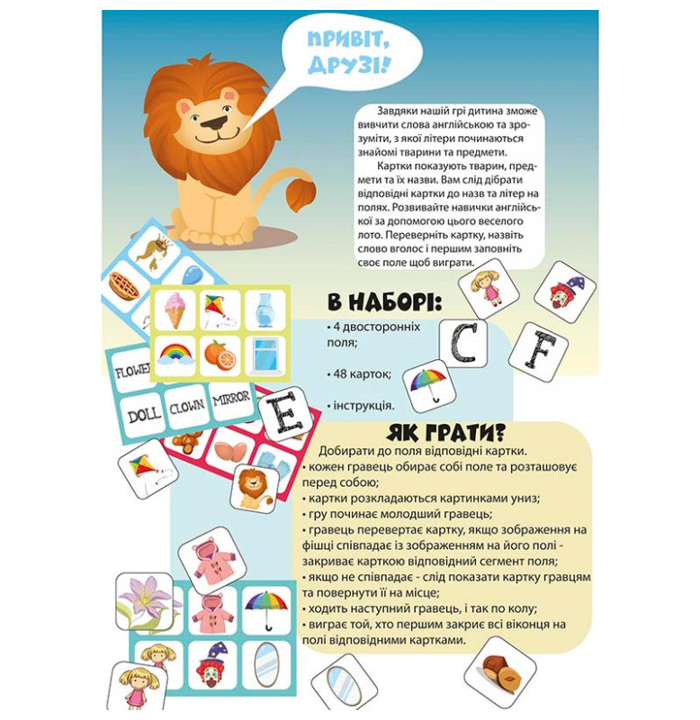Розвиваюча гра, яка знайомить дітей з базовою англійською лексикою через яскраві зображення та прості асоціації. Ігровий формат поєднує елементи лото та навчальних пазлів, роблячи процес засвоєння нових слів цікавим і ненав'язливим.