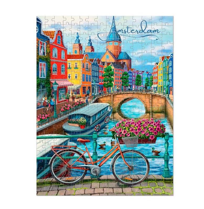 Пориньте в атмосферу одного з найромантичніших міст Європи: вузькі канали, старовинні будинки з кулястими дахами, велосипедні прогулянки під м'яким світлом ліхтарів. Цей пазл — невелика візуальна мандрівка, що відкриває чарівність Амстердама у кольорах і деталях.