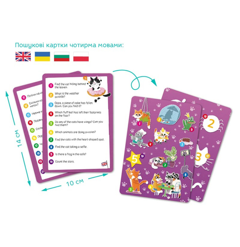 Зануртеся в атмосферу затишного кафе, де кожен кут наповнений милими котами та маленькими секретами. Яскрава ілюстрація запрошує до гри у пошук предметів і деталей, що розвиває уважність та терпіння у гравців будь-якого віку.