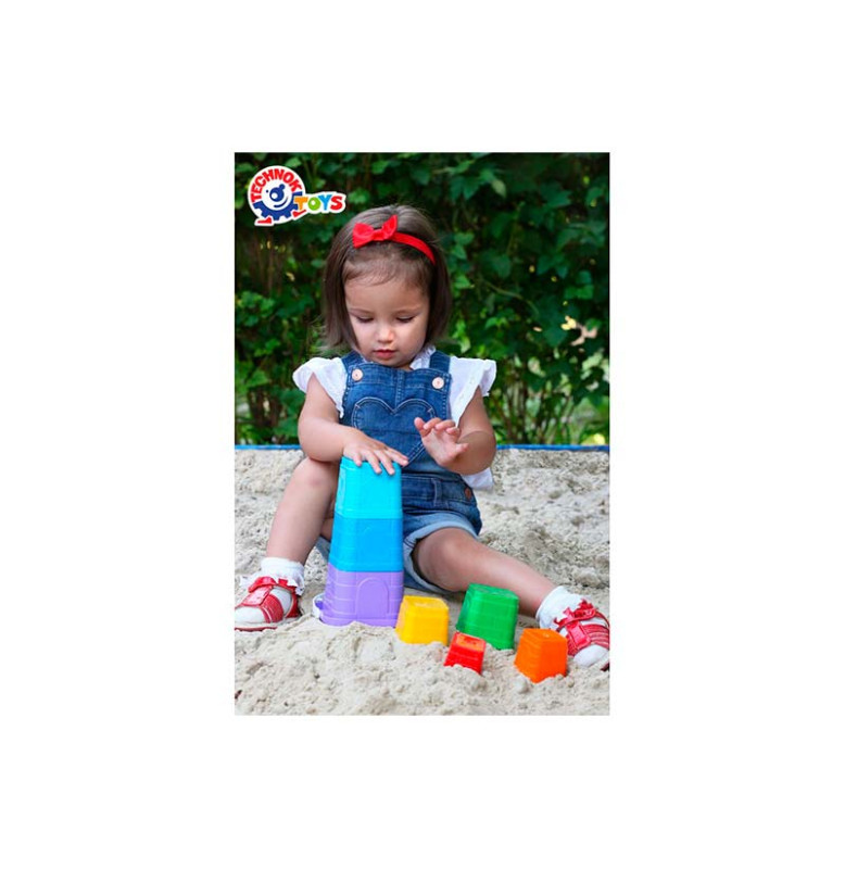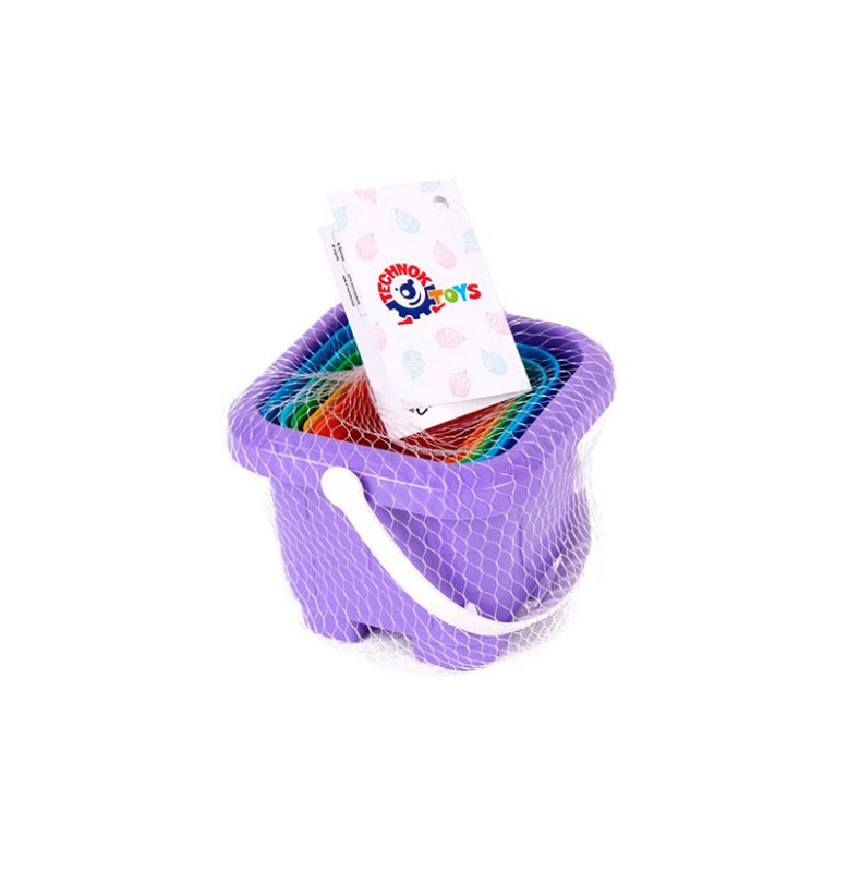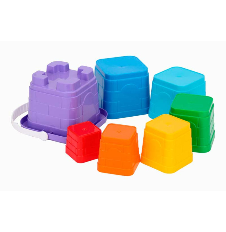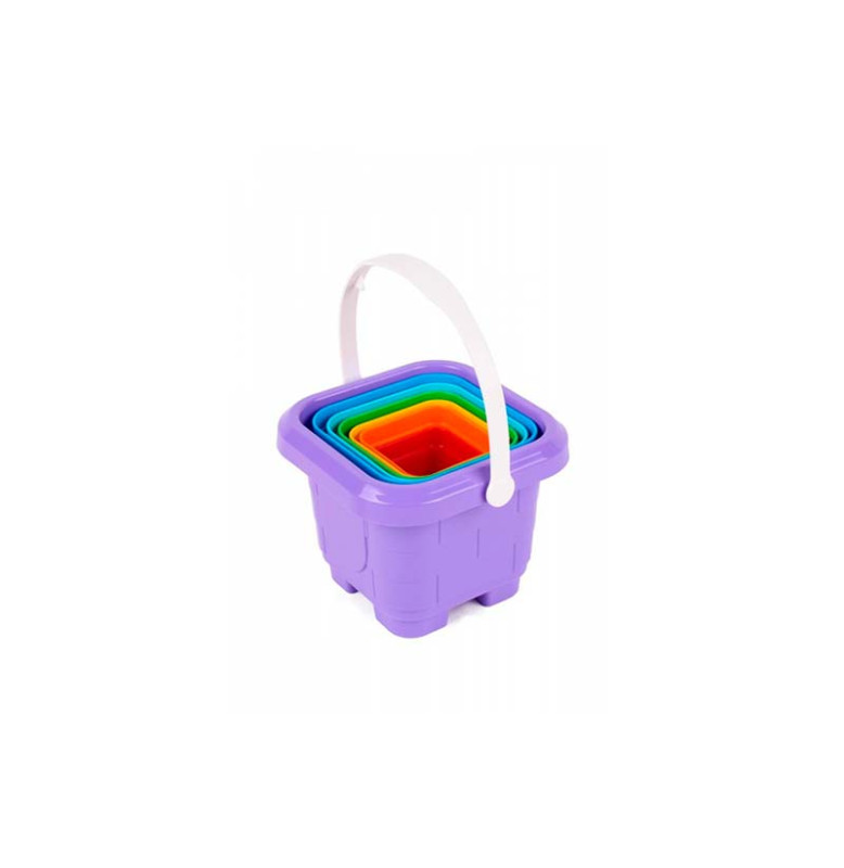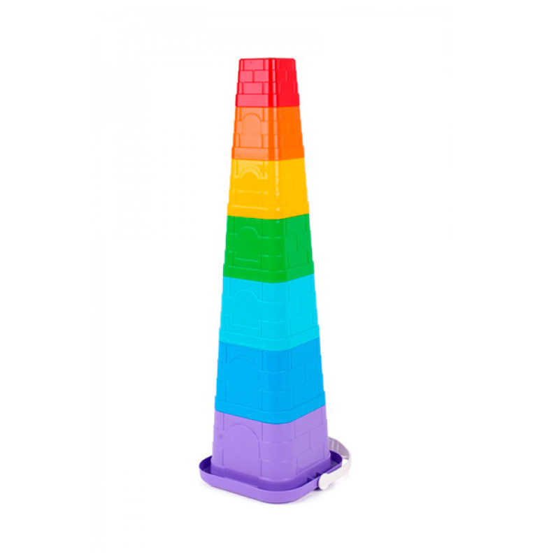 Яскрава пірамідка у кольорах веселки. Особливістю іграшки є те, що всі формочки можна скласти у квадратне відерко з ручкою. Так іграшку зручно переносити, брати з собою на прогулянку, у пісочницю чи дитячий садочок.