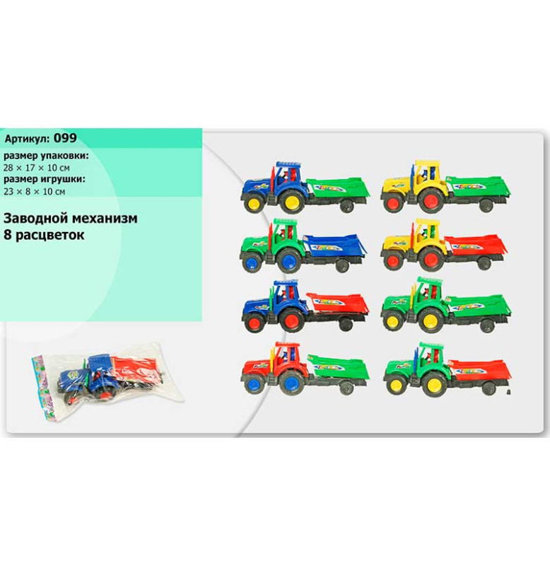 Трактор инерц 099 (216шт/2) 8 цветов, в ассортименте, с прицепом, в пакете 28*17*10см