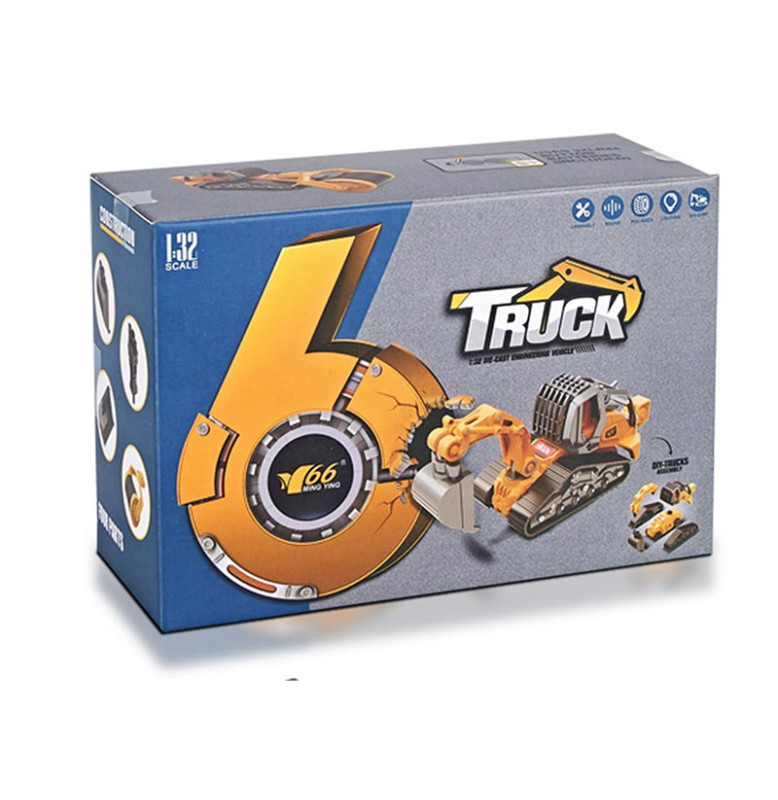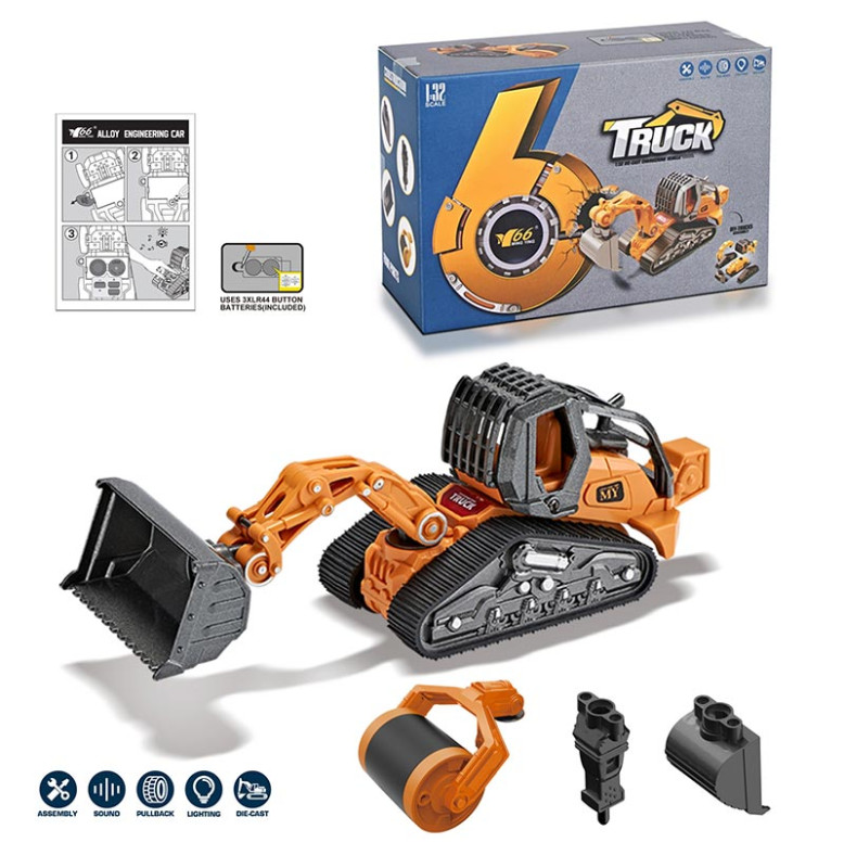 В комплекте несколько сменных головок: ковш для копания, лопата-ковш, ударный бурь и дорожный каток, позволяющий превращать экскаватор в различные виды строительной техники.