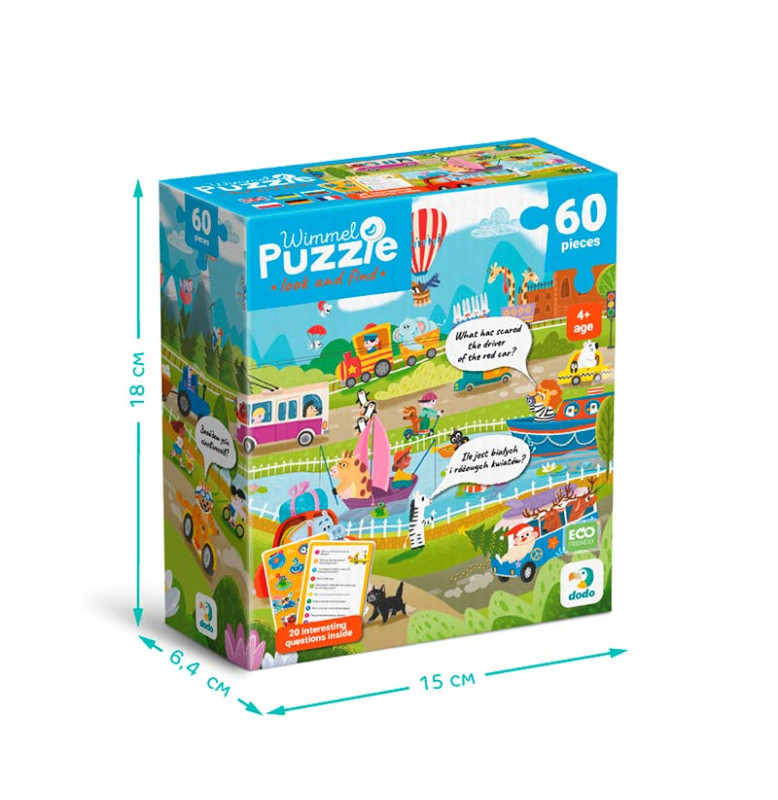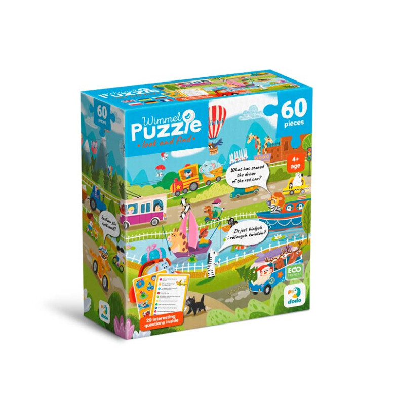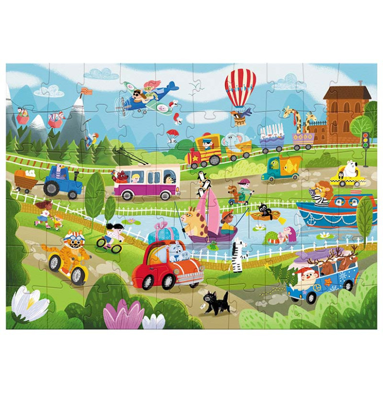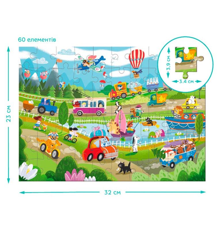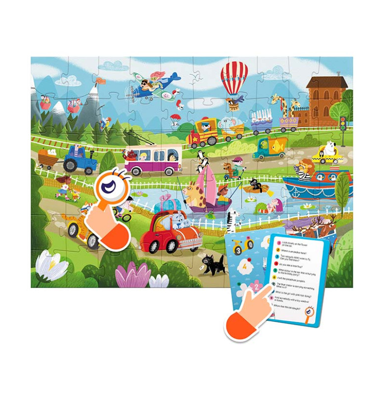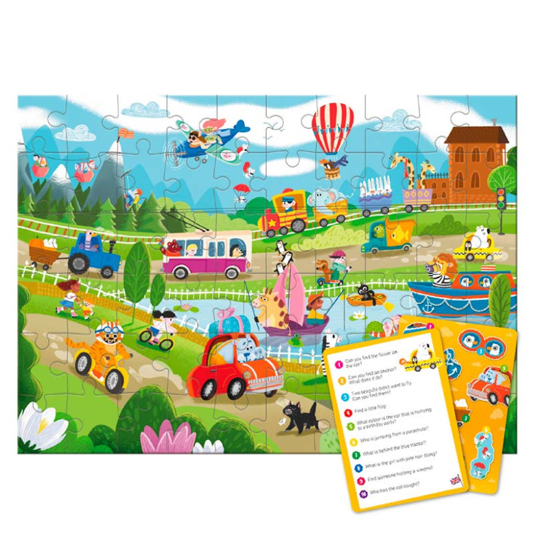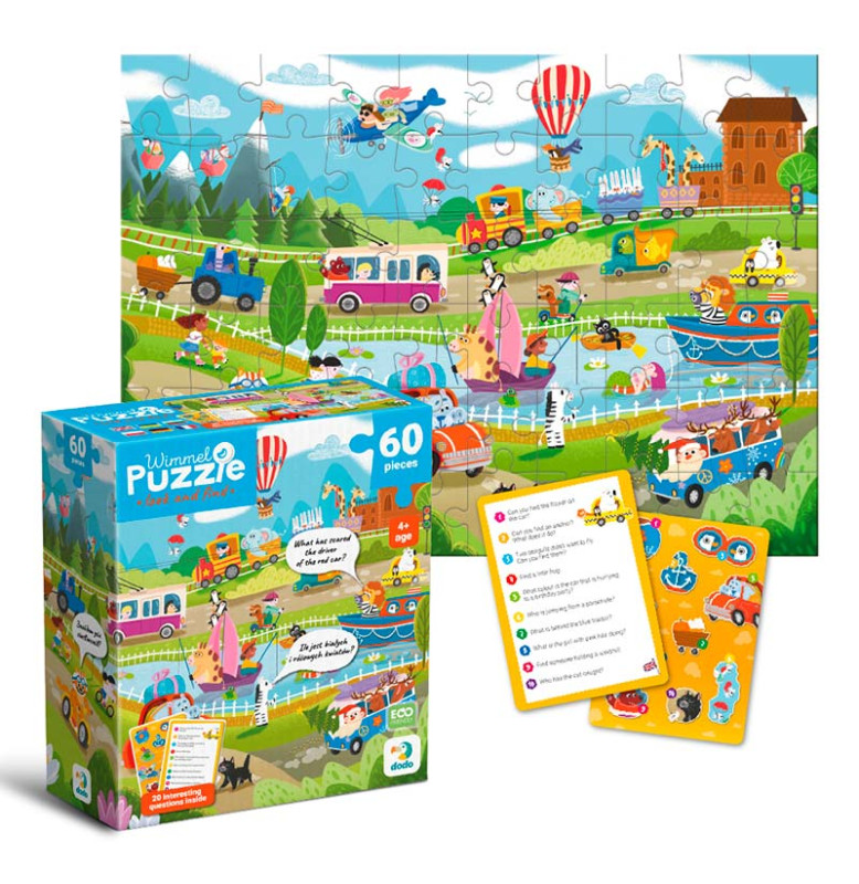 Що робити, якщо набридло ходити пішки? Обрати для себе транспортний засіб... Але який? Визначитися вашому малюкові допоможе наш вімель пазл, адже на ньому зображені, мабуть, усі існуючі варіанти транспорту: від повітряної кулі до земних роликів. На зображенні так багато транспорту та водіїв, що полічити їх здається викликом. А у вас вийде? Особливість вімель пазлу — кількість елементів на зображенні, адже пазл буквально кишить персонажами. Задача дитини — знайти потрібний елемент, який зазначений на картці із завданнями. Гра з таким пазлом вчить малечу кмітливості та концентрації уваги.