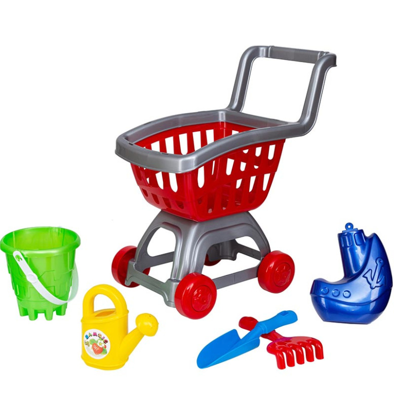 Візок з кошиком – це точна копія дорослого кошика з супермаркету, який дитина може використовувати для покупок разом з батьками. Незначна вага і хороші ходові якості не викликають складнощів з керуванням, тому дитина може самостійно її переміщати. Іграшка виготовлена з міцного, екологічно чистого пластику, що витримує значні навантаження. На сонці пластик не вигорає і не деформується. У візочку знаходяться відро, пасочка, лійка, лопатка та грабельки.